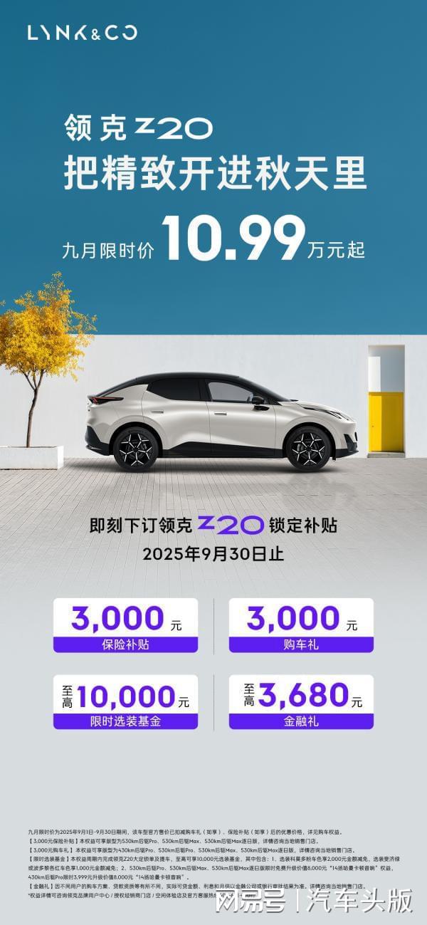 对于追求高端生活延伸的消费者来说,领克Z20九月推出的限时购车政策,进一步降低了拥有门槛。即日起至2025年9月30日,全系10.99万起,下订可享受多重礼遇:3000元保险补贴、3000元购车礼、至高10000元的限时选装基金,以及至高3680元的金融礼。这些政策从购车成本、用车保障等维度提供支持,让消费者无需超出预算,就能拥有一款能衔接高奢酒店、奢品店等场景,撑起高端生活延伸的座驾。